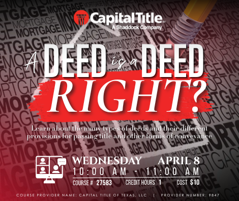 COURSE PROVIDER NAME: CAPITAL TITLE OF TEXAS, LLC | PROVIDER NUMBER: 9847 COURSE# 27583 | CREDIT HOURS 1 | COST $10 PAYMENT LINK: https://square.link/u/9zp5J24y