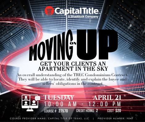 COURSE PROVIDER NAME: CAPITAL TITLE OF TEXAS, LLC | PROVIDER NUMBER: 9847 COURSE# 27570 | CREDIT HOURS 2 | COST $20 PAYMENT LINK: https://square.link/u/XjkKgB9d