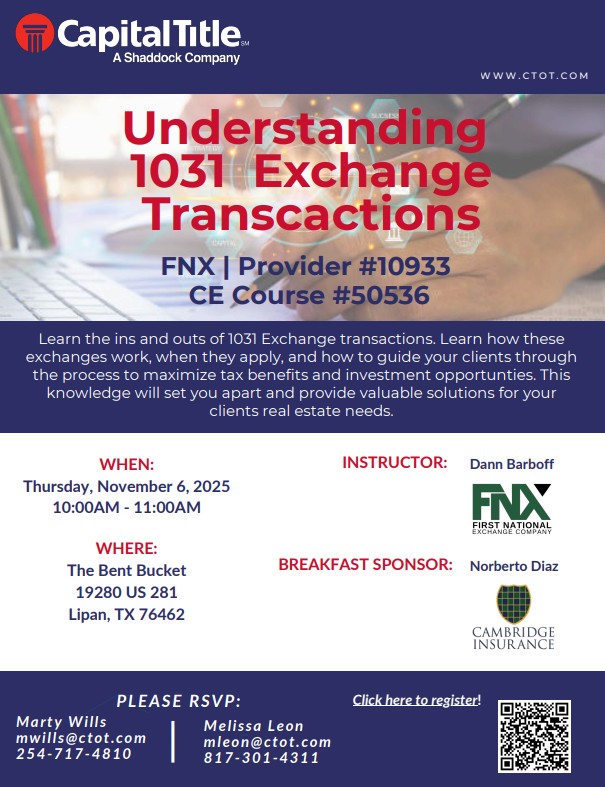 Join us! UNDERSTANDING 1031 EXCHANGE TRANSACTIONS THURSDAY, NOVEMBER 6TH | 10:00 TO 11:00 AM FNX | Provider #10933 | Course #50536 Register Here: https://form.jotform.com/243446174258158 OR RSVP To: […]